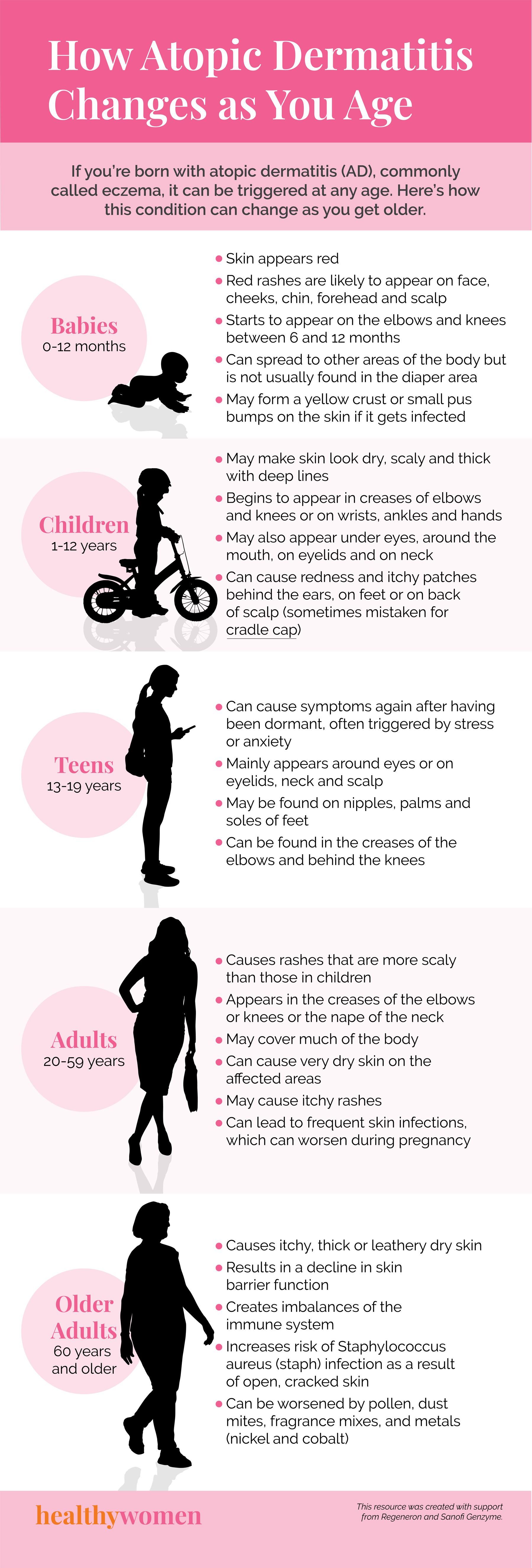 If you're born with atopic dermatitis (AD), commonly called eczema, it can be triggered at any age. Here's how this condition can change as you get older.