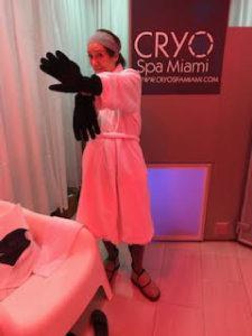 Dr. Turovsky explained that my session would last just two minutes, and that the booties and gloves they supplied would assure my extremities would not get frost-bitten. (I wore my own sports bra and bottoms, and removed all my jewelry.) Usually done in a series of about three-minute sessions (5 to 10 are suggested to see full results), this one would just be a "tease" and give me an idea of how it feels to face sub-Arctic temps.