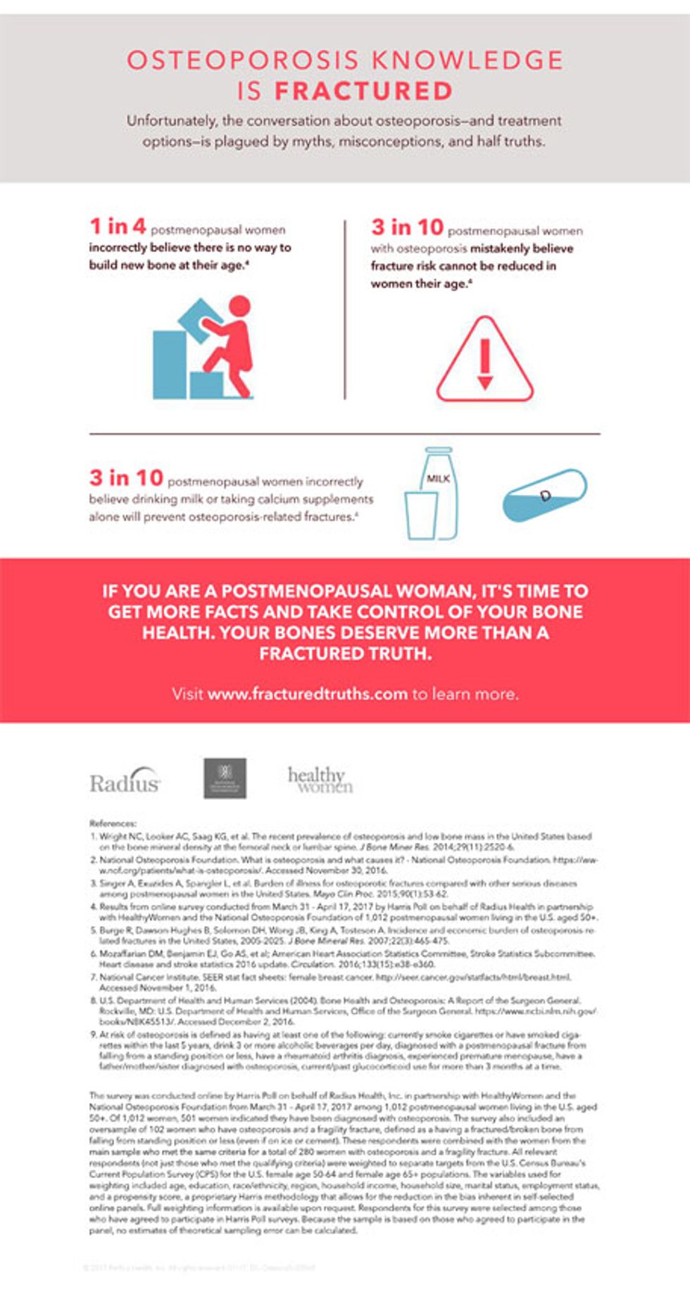 Yet, a startling 82 percent of postmenopausal women did not identify such bone fractures as a possible risk factor for osteoporosis, according to results from a new Harris Poll survey conducted on behalf of Radius Health, in partnership with HealthyWomen and the National Osteoporosis Foundation. The survey aimed to measure osteoporosis knowledge of 1,012 postmenopausal women in the United States ages 50 and older, including women diagnosed with osteoporosis and those who aren't.