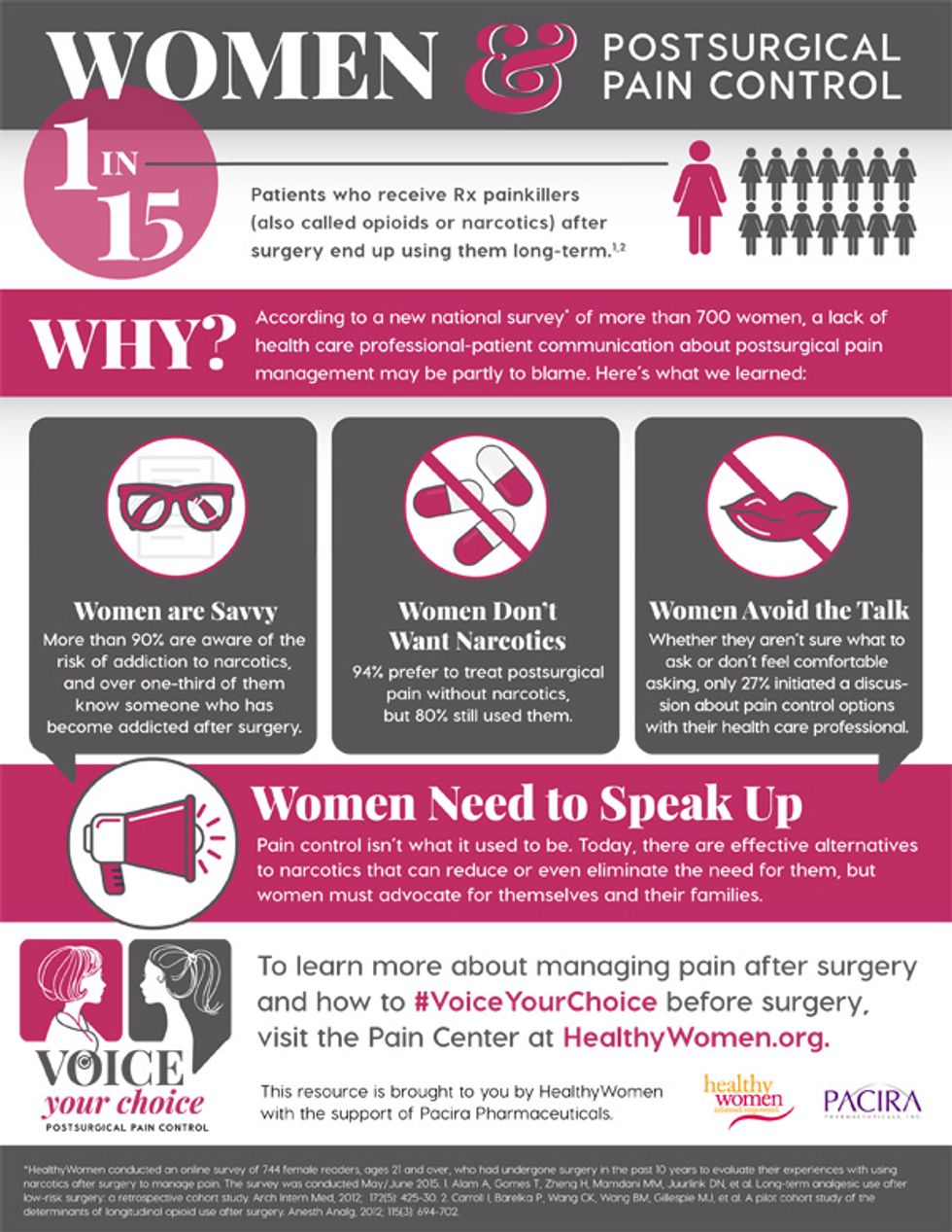 According to a recent HealthyWomen survey, 99 percent of women want a choice in how their pain is managed after surgery, with 94 percent of women saying if they could effectively manage their pain without narcotics —also known as opioids and prescription painkillers—they would. And yet, 80 percent of the women surveyed still used narcotics to manage postsurgical pain.
