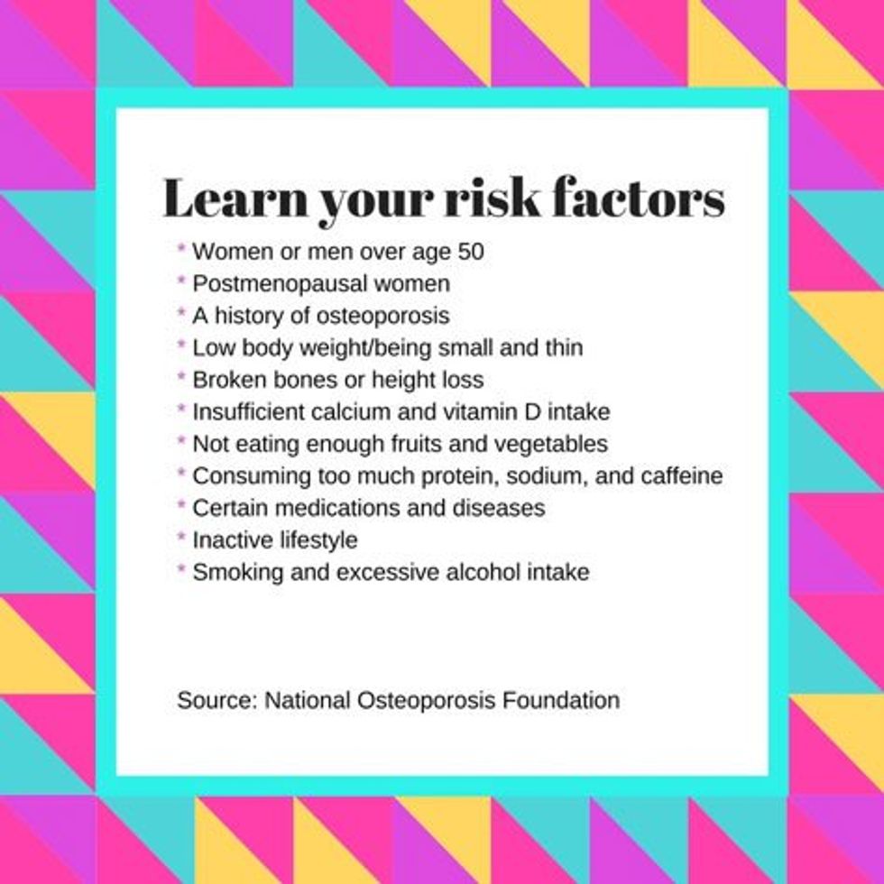 - Get to know risk factors. These include age, gender, lifestyle, medical history, family history and whether you take medication or have medical conditions that can lead to bone loss. (For example, I'm 50+, postmenopausal, am small and thin—all higher risk factors. Ugh!)
