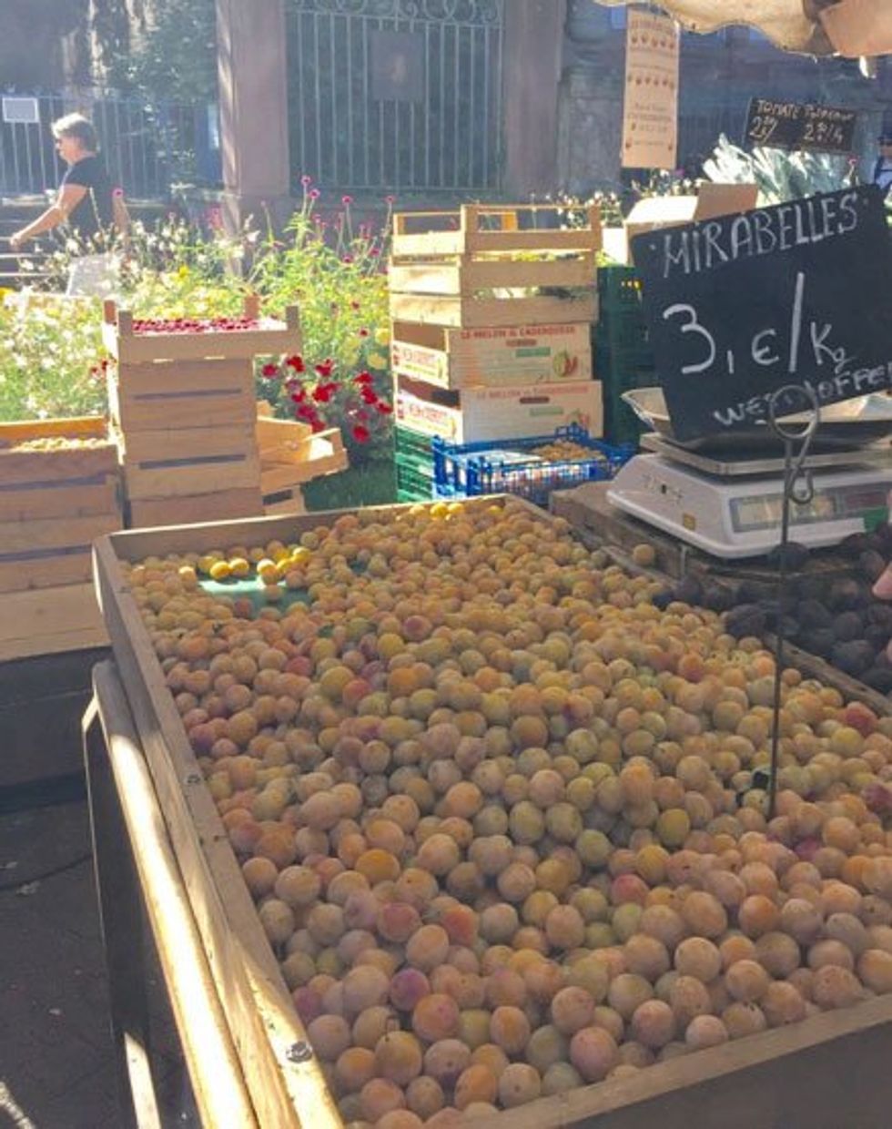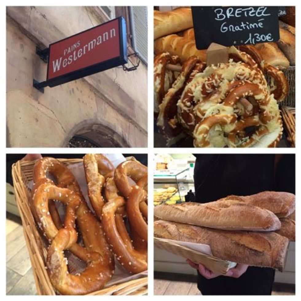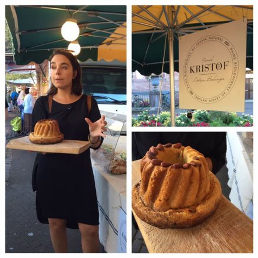 We sampled sweet mirabelles, tiny yellow plums, which were in season. We bought some authentic Alsace pretzels for consuming at lunch. We tried kougelhopf, a traditional Alsace bread from the organic bakery Kristof Boulangerie. "It's like a brioche but round like the sun," said Virginie. "Kougelhopf is eaten on Sunday mornings. It takes a long time to bake and must rise twice. You can't keep this bread for more than a few days."