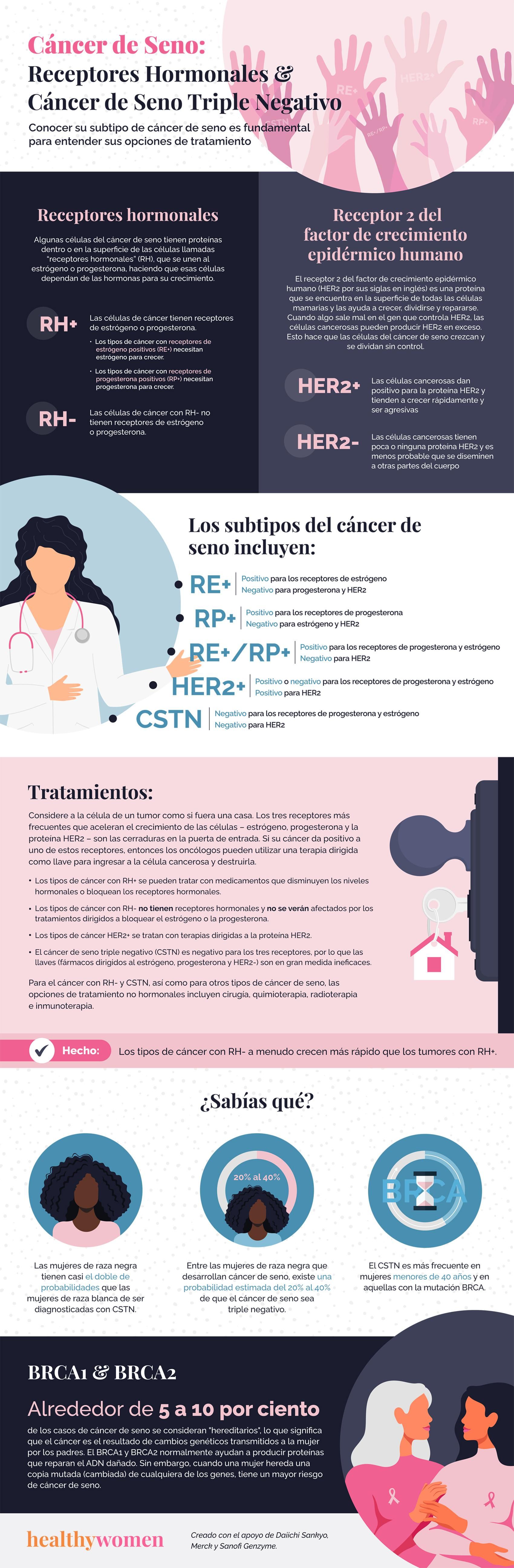 Algunas células del cáncer de seno tienen proteínas dentro o en la superficie de las células llamadas “receptores hormonales” (RH), que se unen al estrógeno o progesterona, haciendo que esas células dependan de las hormonas para su crecimiento.