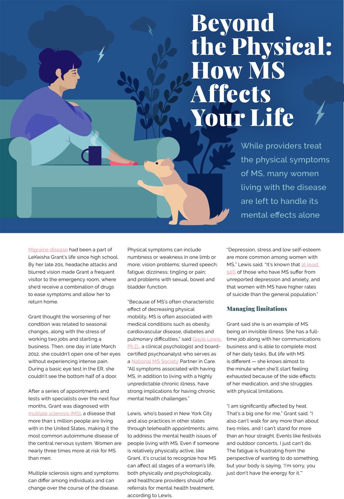 Lewis, who’s based in New York City and also practices in other states through telehealth appointments, aims to address the mental health issues of people living with MS. Even if someone is relatively physically active, like Grant, it’s crucial to recognize how MS can affect all stages of a woman’s life, both physically and psychologically, and healthcare providers should offer referrals for mental health treatment, according to Lewis.
