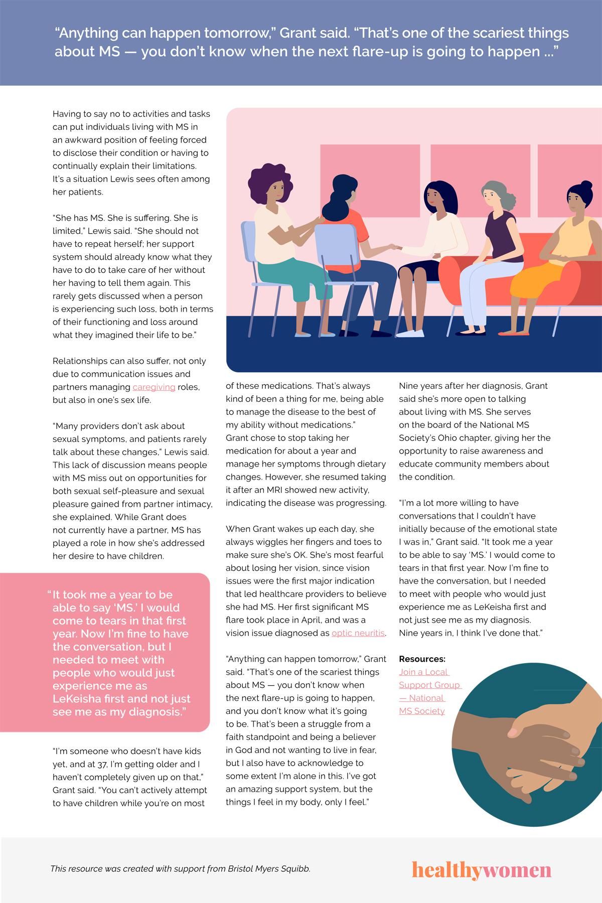 “I’m a lot more willing to have conversations that I couldn’t have initially because of the emotional state I was in,” Grant said. “It took me a year to be able to say ‘MS.’ I would come to tears in that first year. Now I’m fine to have the conversation, but I needed to meet with people who would just experience me as LeKeisha first and not just see me as my diagnosis. Nine years in, I think I’ve done that.”