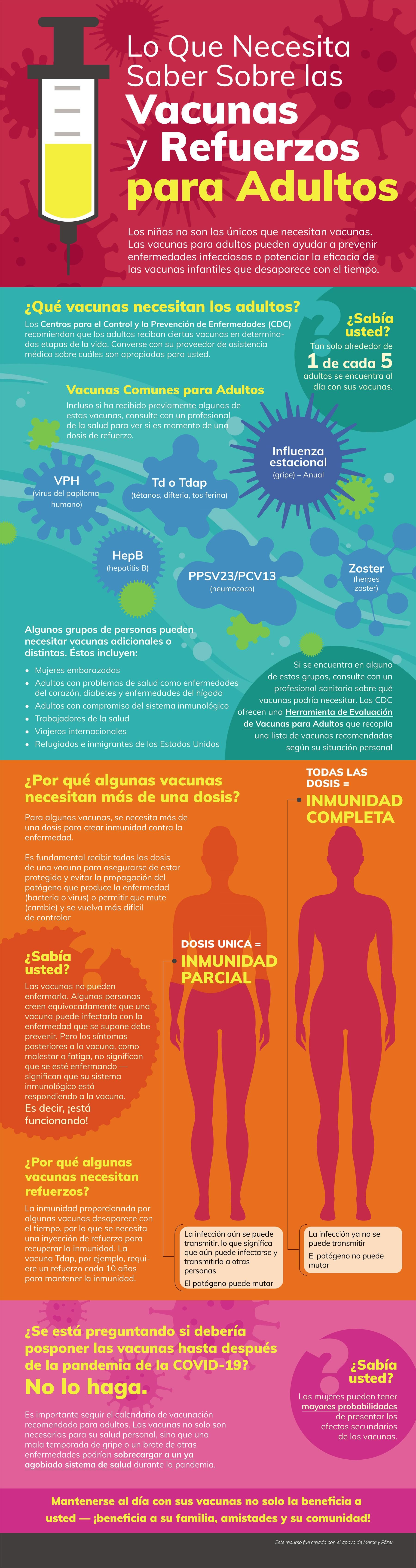 Los niños no son los únicos que necesitan vacunas. Las vacunas para adultos pueden ayudar a prevenir enfermedades infecciosas o potenciar la eficacia de las vacunas infantiles que desaparece con el tiempo.