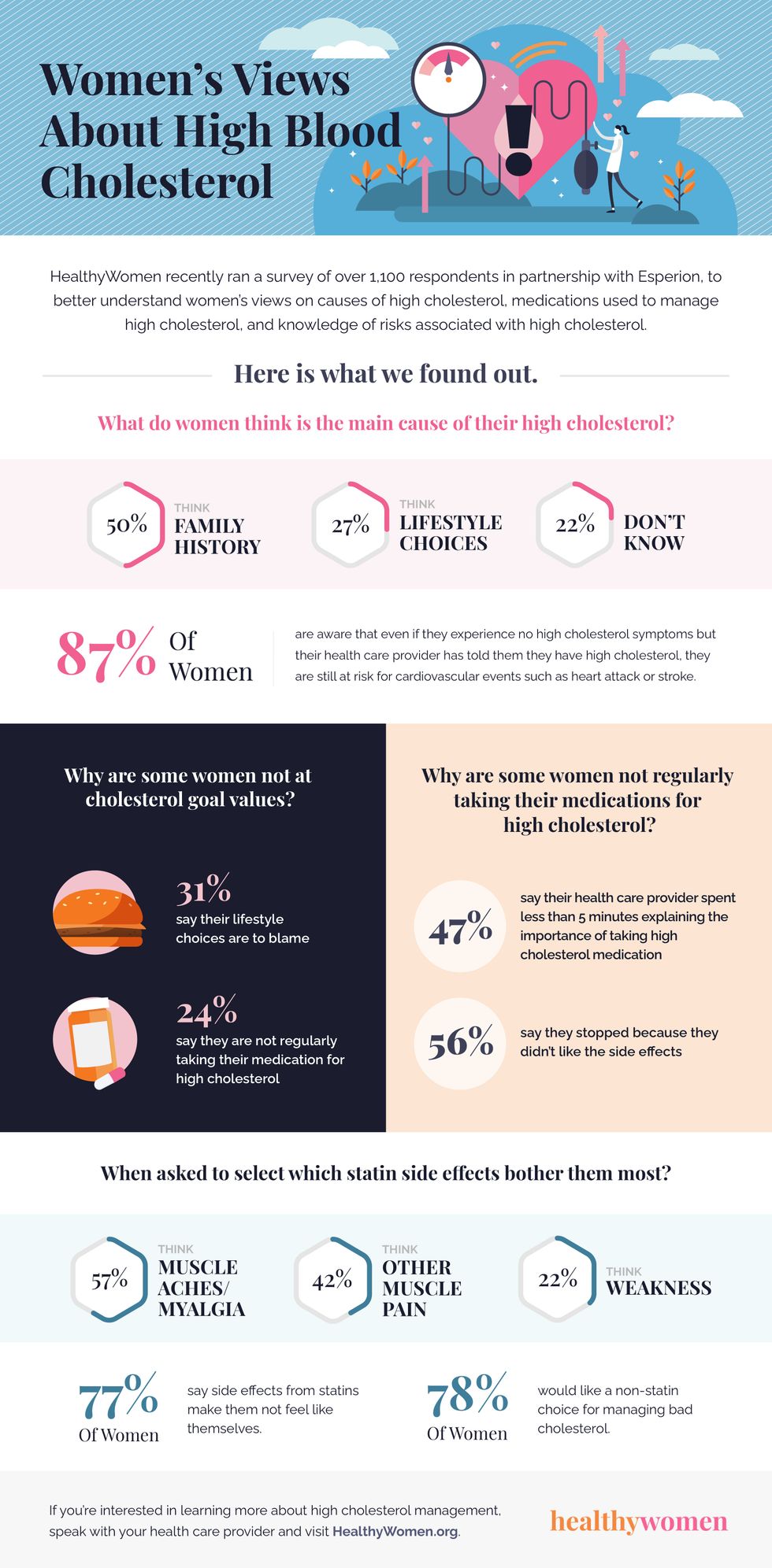 Healthy Women recently ran a survey of over 1,100 respondents, in partnership with Esperion, to better understand women's views on high blood cholesterol — causes of high cholesterol, medications used to manage it, and knowledge of risks associated with it. Here's what we learned.