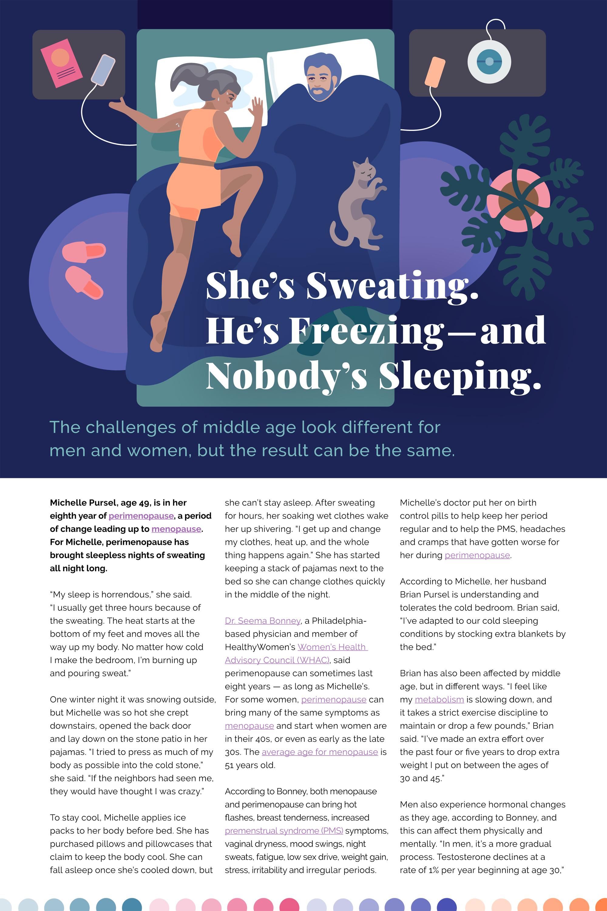 Michelle Pursel, age 49, is in her eighth year of perimenopause, a period of change leading up to menopause. For Michelle, perimenopause has brought sleepless nights of sweating all night long.